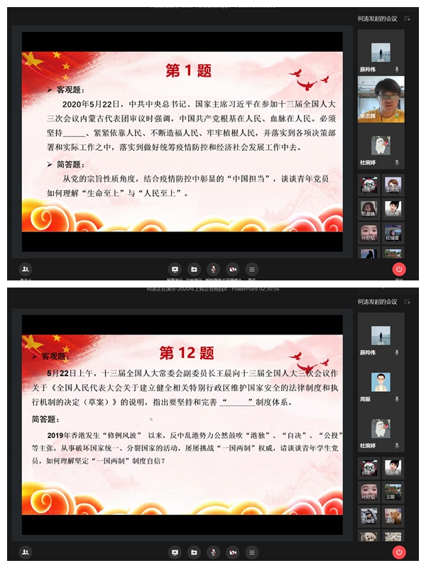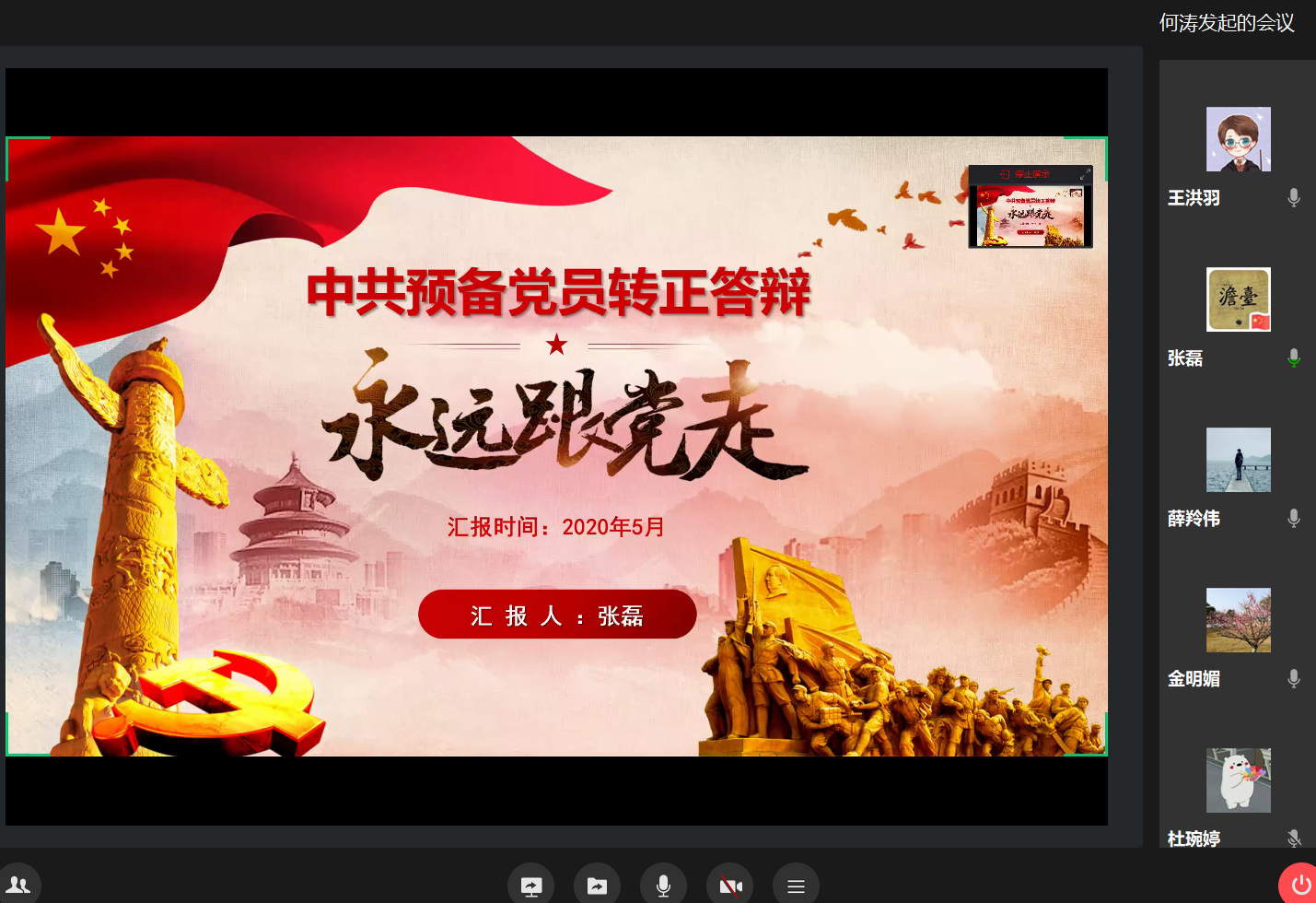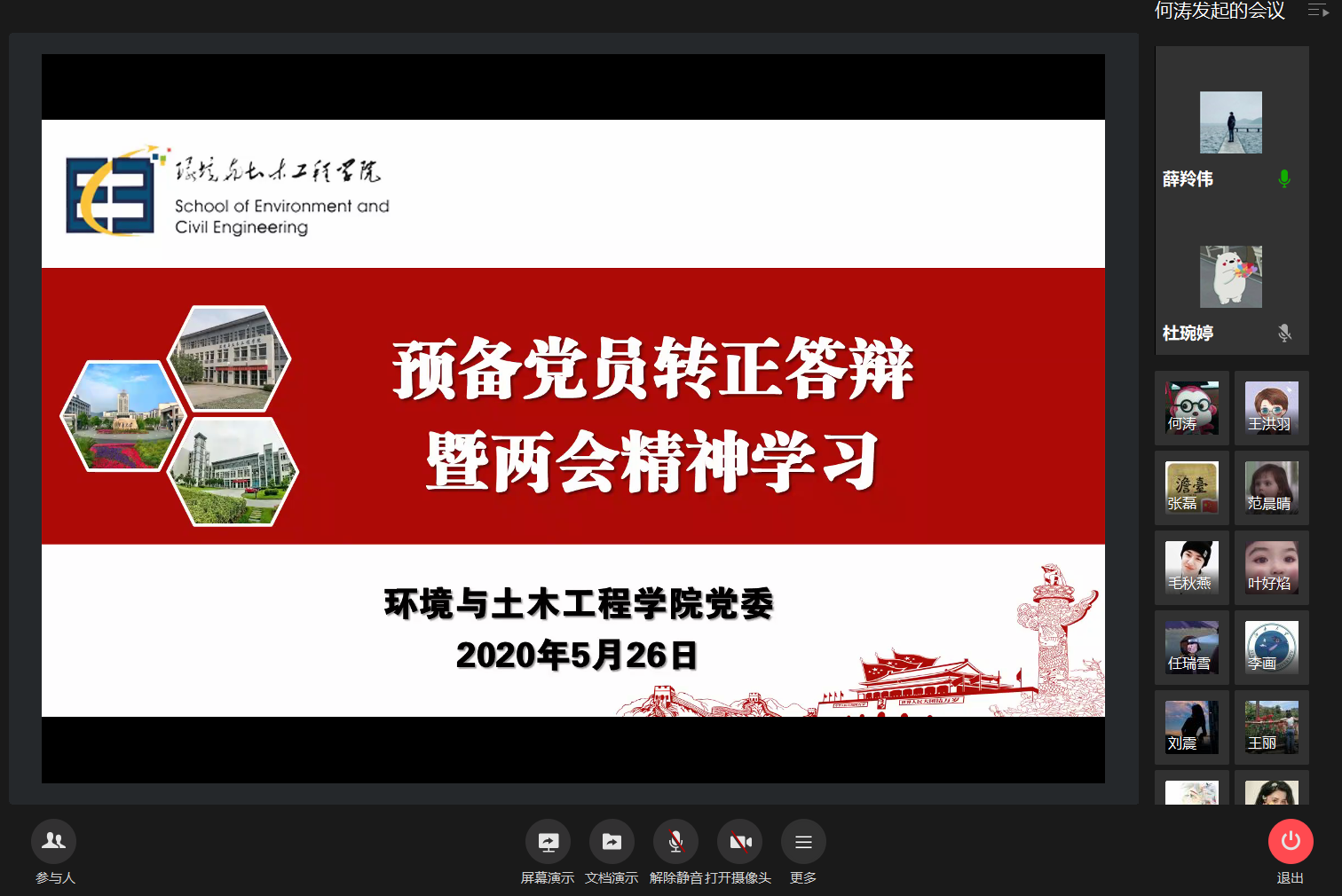 为进一步完善员工预备党员考察机制,促进员工党员学习两会精神,切实发挥员工党员先锋模范作用,环境与土木工程公司党委举行本学期预备党员转正答辩暨两会精神学习会。公司党委副书记兼副经理金明媚,学工办主任蒋达锋,公司党委秘书沈炎,辅导员周佳赟、薛羚伟担任答辩评委,本科生、研究生各支部党员参加会议。本次会议以线上形式开展,由辅导员何涛主持。