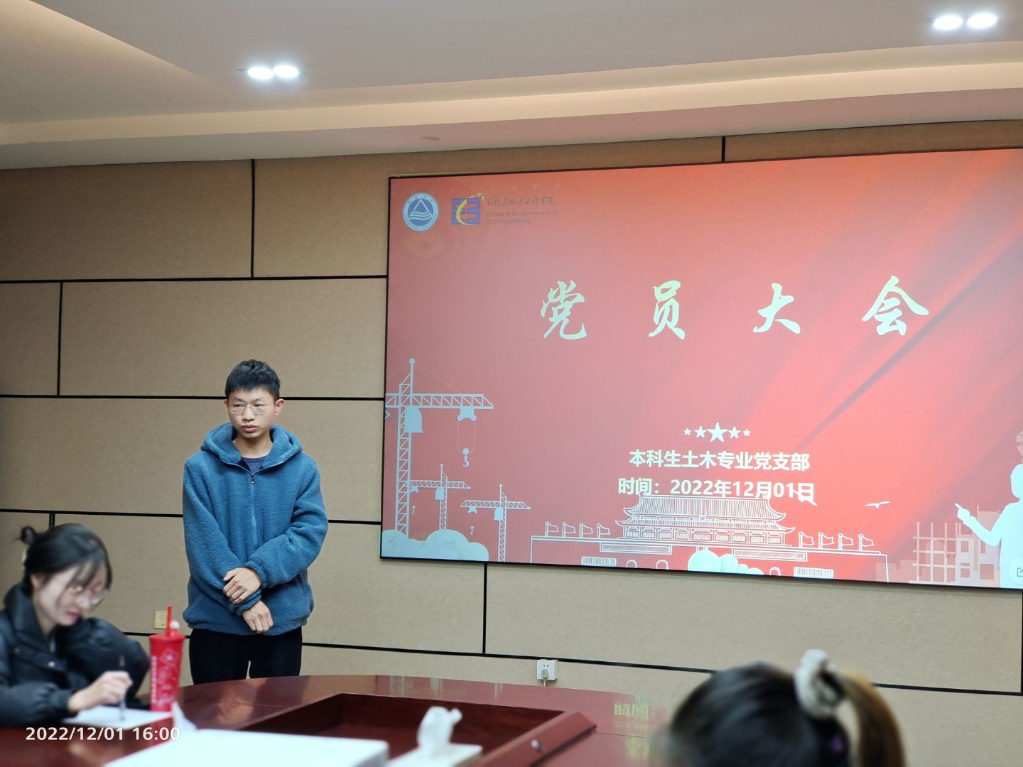 为进一步加强党员队伍建设,为基层党组织注入新鲜血液,贯彻学习党的二十大精神,2022年12月1日,PA视讯环境与土木工程公司本科生土木专业党支部于公司楼D305会议室召开了支部大会,讨论预备党员转正。党支部全体党员参加本次会议,支部书记何涛主持会议。会议严格按照规定的程序进行。