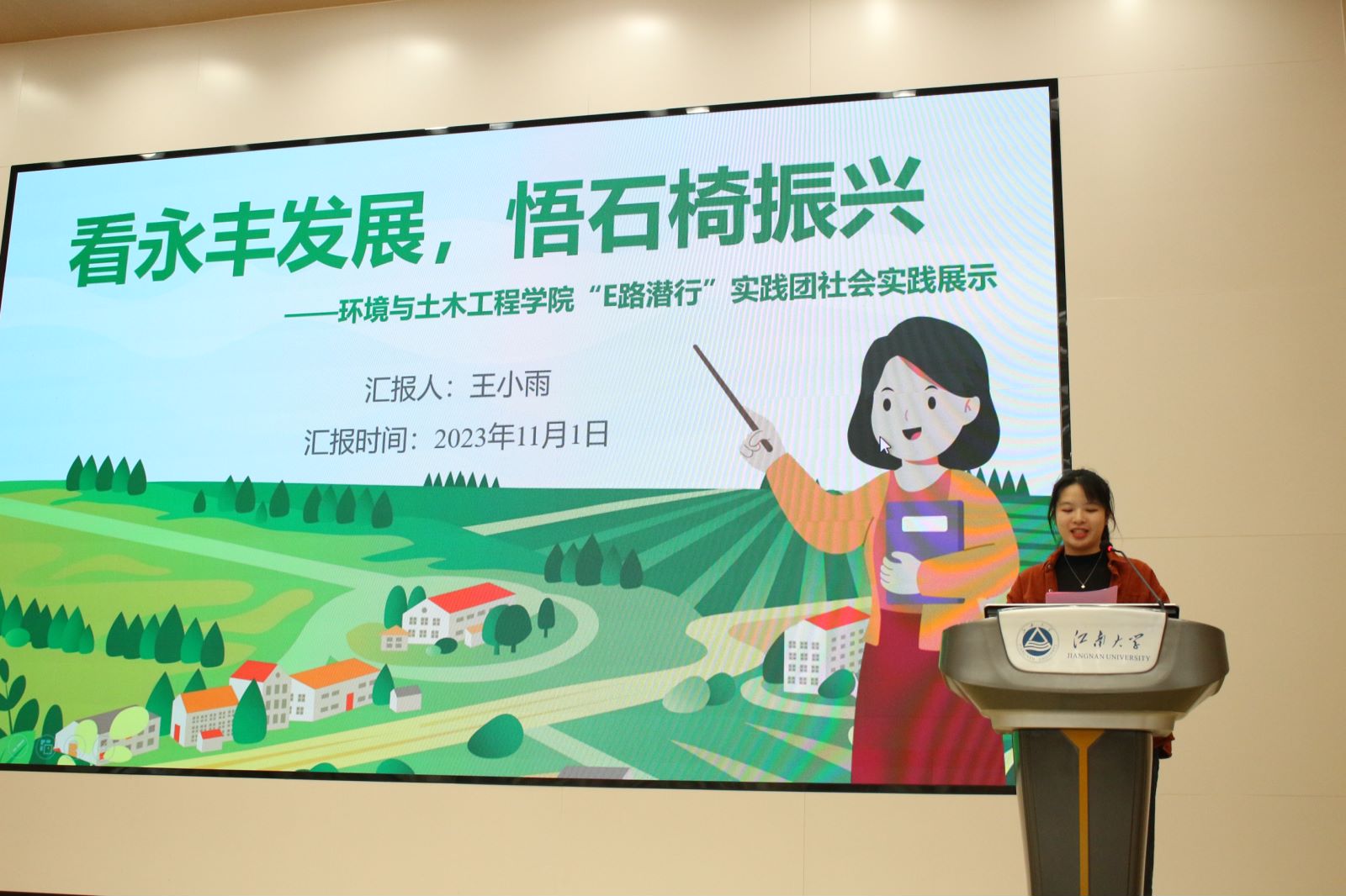 2023年暑期社会实践优秀项目代表王小雨展示奔赴四川眉山市永丰村与绵阳北川石椅的调研实践经历。她感悟到在乡村振兴中,要做到传承与创新并存,自然与科技融合,弘扬抗震救灾精神,共建美丽乡村、美丽中国。老员工双碳科普协会负责人代怡馨回顾总结“E路潜行”生态文明志愿服务团队从成立至今5年多的建设历程,从选择、发展、传承等方面,向我们介绍了老员工双碳科普协会(青年环保公司)的发展理念和志愿服务实践经历,展现环境与土木工程公司学子用青春和汗水奋发向上,勇毅前行的奋斗姿态与优良风貌。