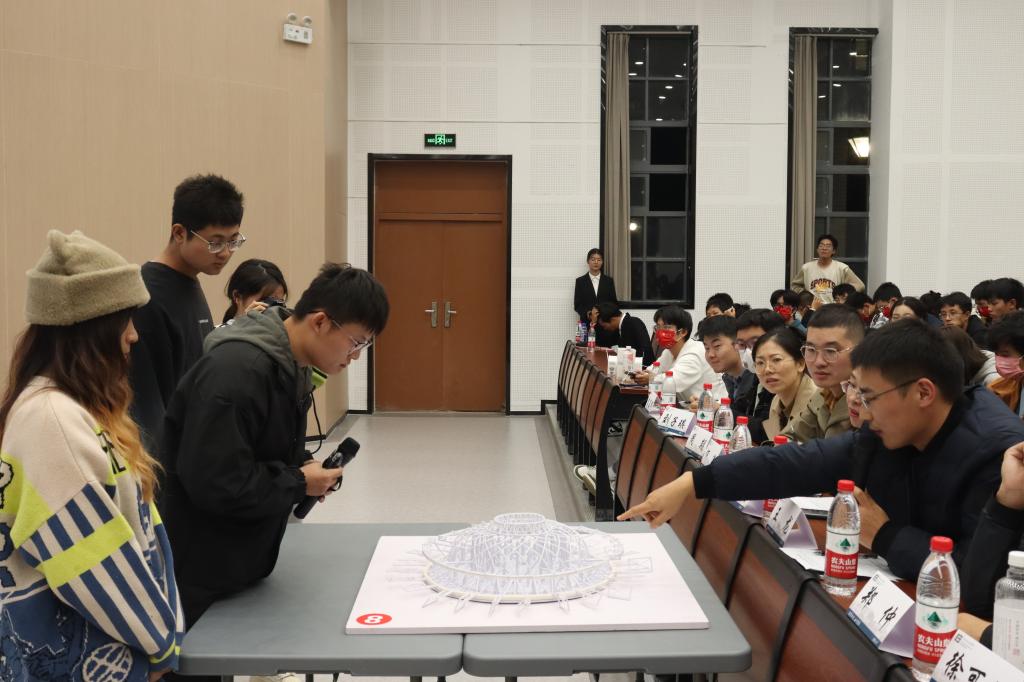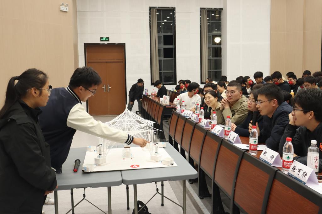 来自环境与土木工程公司、机械工程公司、设计公司、纺织科学与工程公司、物联网工程公司的12支决赛队伍进行激烈角逐,决赛采用团队展示与答辩相结合的形式,每组选手分别展示模型设计及其功能,评委老师围绕模型创新性、材料合理性、力学概论、制作工艺四部分进行评分。