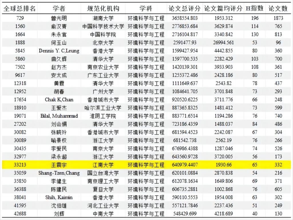 环境科学与工程领域中国学者名单节选