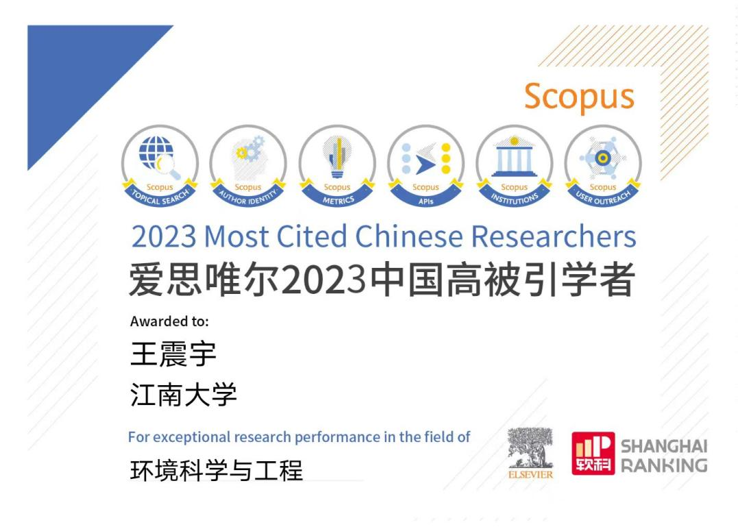 3月27日,爱思唯尔(Elsevier)重磅发布了2023“中国高被引学者”(Highly Cited Chinese Researchers)榜单。其中环境科学与工程学科共163人入选。PA视讯集团官网王震宇教授继入选Research.com 2023“全球顶尖科学家榜单”、全球学者库2023“全球学者学术影响力排名(终身学术影响力榜)”名录之后,再次荣登2023“中国高被引学者”榜单。王震宇教授连续四年(2020-2023)入选该高被引学者榜单也标志着公司环境学科的科研水平和影响力逐渐持续提升。