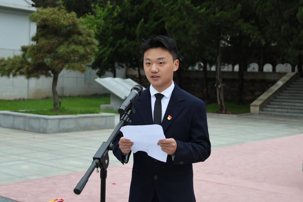 全体师生肃立,面向纪念碑默哀,而后敬献花圈,并向纪念碑三鞠躬。衡延笃作为教师代表发言,他介绍了在中国共产党的坚强领导下,中国人民为了和平做出的艰苦卓绝的努力,号召全体师生要不忘历史、铭记责任,学习、传承先烈精神,练就过硬本领,挺膺担当。员工党员代表朱光辉紧接着发言,他表示新时代的青年要继承先烈遗志,继往开来,奋发向上,为实现中华民族伟大复兴而不懈奋斗。随后,薛羚伟带领全体青马班同学以及现场所有的共青团员,一起重温了入团宣誓,并希望所有青年同学永葆对祖国纯粹和清澈的爱。