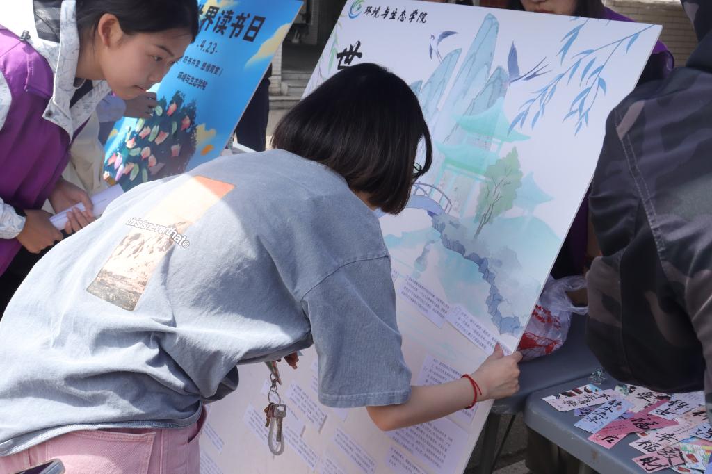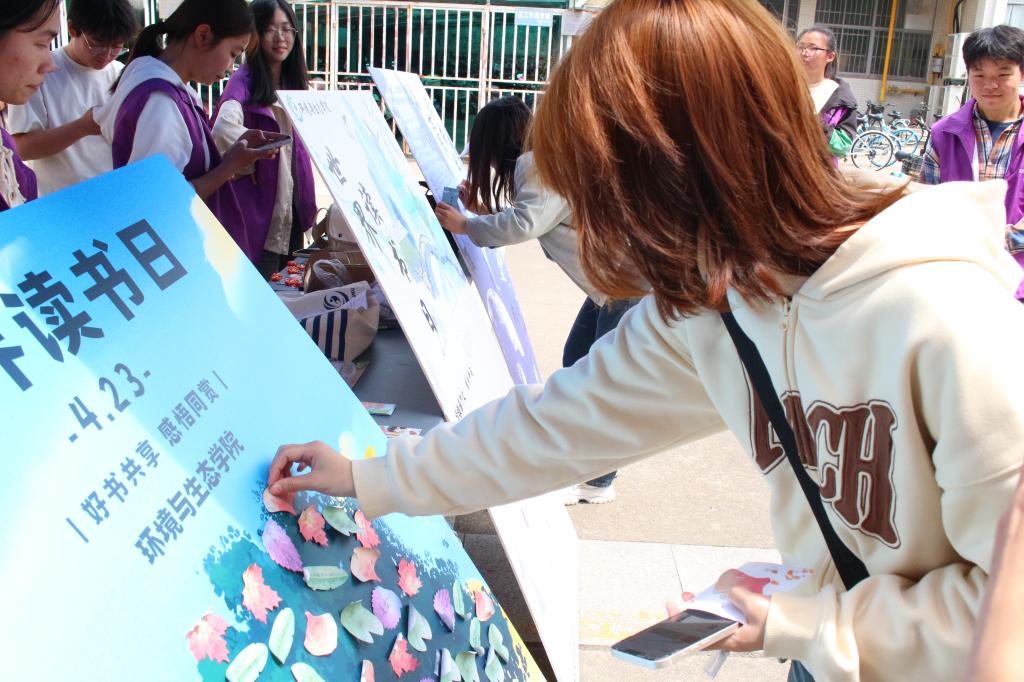 “江南题叶,翰墨飘香”活动采用好书好句分享的形式,旨在引导同学们成为文化的传承者、传播者。同学们留下期待与愿景,或是喜爱的一句话,或是一本书。活动还吸引了两名外国职工,在工作人员的帮助下,他们也参与进到了活动中来。展板上密密麻麻地写满了员工们的留言,每一句留言都像是一颗璀璨的星辰,闪烁着智慧的光芒,讲述着一个个精彩的故事。
