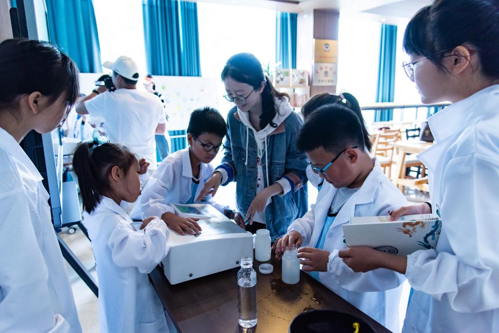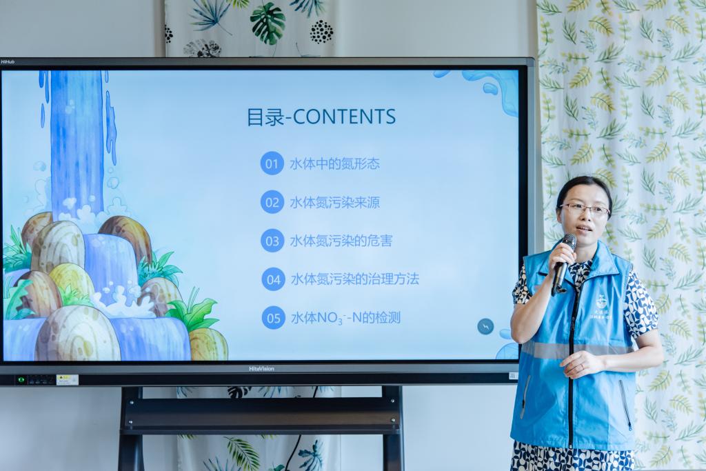 首先郁红艳老师从水体氮的种类和来源、水体氮污染和治理方法、水体中硝态氮及其含量测定方法四个方面为小员工们进行了保护水资源的科普讲解,让同学们深刻认识到水体氮污染的危害,从而认识到保护水资源的重要性。科普结束后,郁老师还详细讲解了不同水样的硝态氮含量检测实验过程,随后同学们分为三队由志愿者引导进行实地水样采集和水样中硝态氮含量的测定。郁老师和志愿者们协助小员工们利用紫外可见分光光度计测定了3个不同取样点水样的硝态氮含量,从方法原理、仪器步骤到数据记录,每一步实验步骤的参与让同学们充分体验到了硝态氮的测定工作。同学们兴趣勃勃,每个人都积极操作感受,并向志愿者提出问题,志愿者们也进行了耐心解答,现场氛围十分活跃。科普和实验过程中同学们都积极参与互动,展示了活力、热情和对知识的渴望。