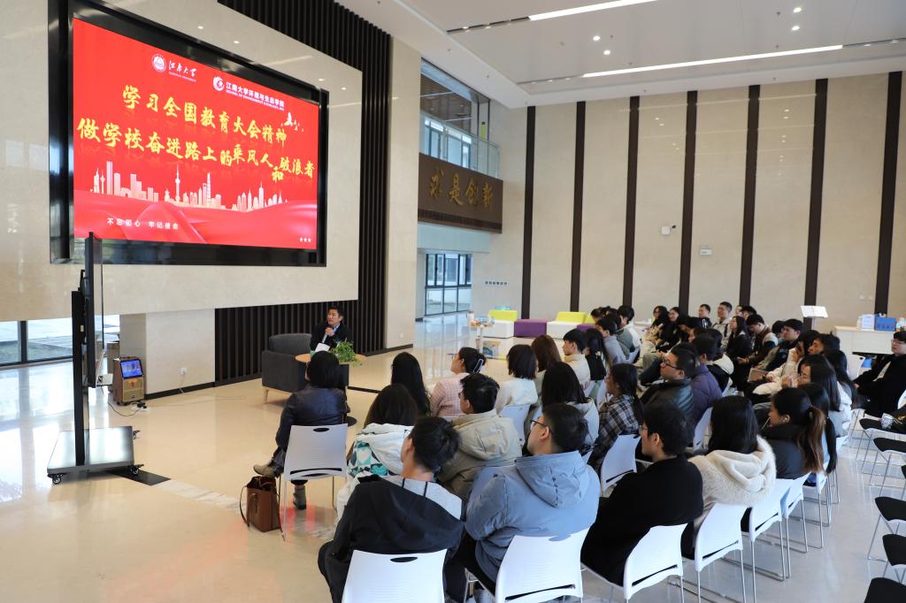 11月29日下午,PA视讯党委副书记戴月波以《学习全国教育大会精神—做公司奋进路上的乘风人和破浪者》为题给PA视讯集团官网东氿校区师生上课。公司党委书记李艳,公司东氿校区党政干部、研究生支部党员参加。
