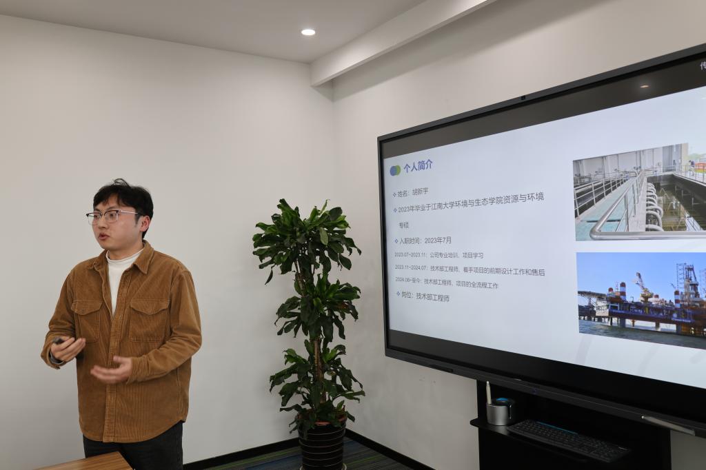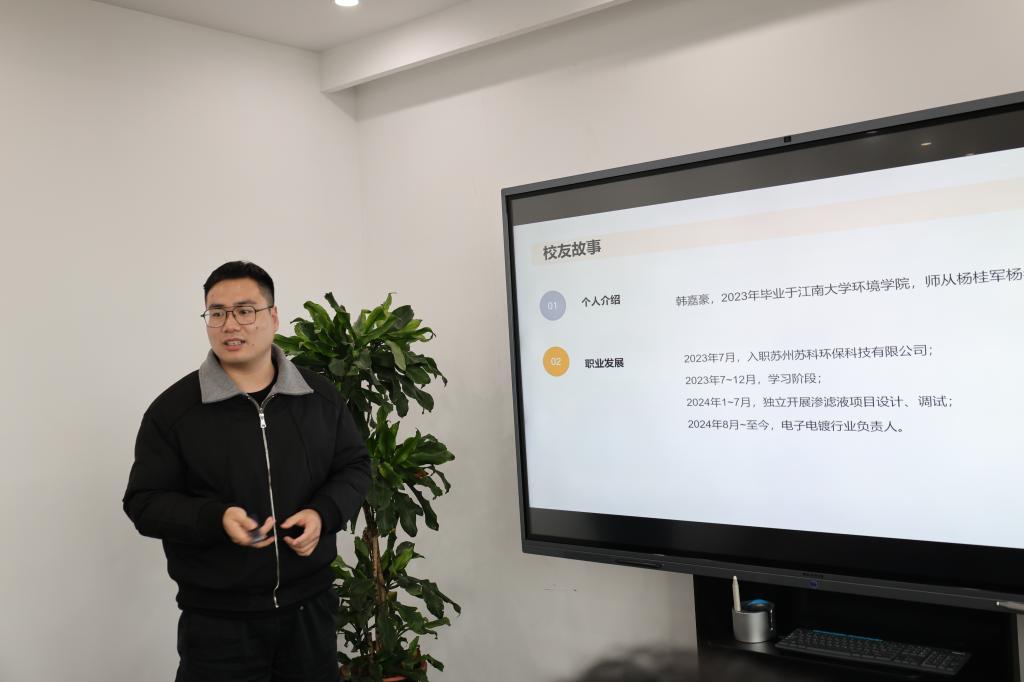 座谈会上,赵艳详细介绍了企业的发展历程、核心业务以及未来规划,并系统阐述了苏科关于“未来菁英计划”人才培养体系,强调企业构建的"技术研发+项目管理"双通道职业发展模式。赵龙博士向在场师生深度解析了“威乐普”膜技术的迭代研发历程与市场应用前景。2023届员工韩嘉豪、胡新宇以技术工程师身份分享了他们从校园到职场的转变过程中,凭借扎实的专业知识和不懈的努力,迅速在技术领域崭露头角。他们的故事不仅激励了在场的学弟学妹们,也为即将步入职场的同学们提供了宝贵的经验和建议。