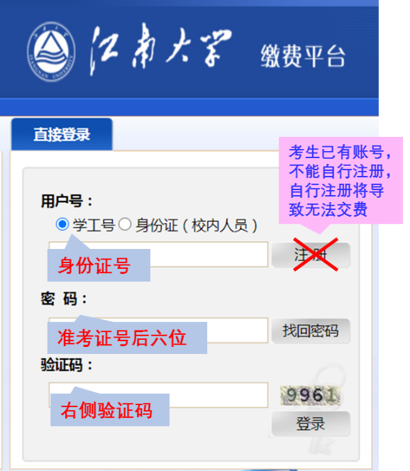 缴费说明:进入复试考生在公司规定的时间内登录“PA视讯缴费平台”交纳复试费用,复试收费标准:80元/生。缴费网址:http://pay.jiangnan.edu.cn/payment/。登录账号为准考证上的考生编号,登录密码为身份证后六位(友情提醒:考生账号已开通,切勿自行注册)。按照提示交费(使用网银),并打印或截图保存付费凭证。